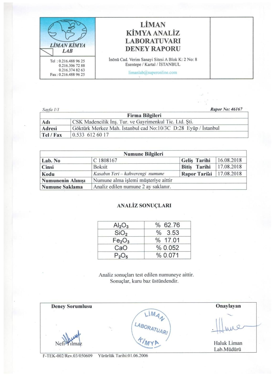 Liman Kimya Analiz Laboratuvarı Deney Raporu aşağıdaki tablodadır: