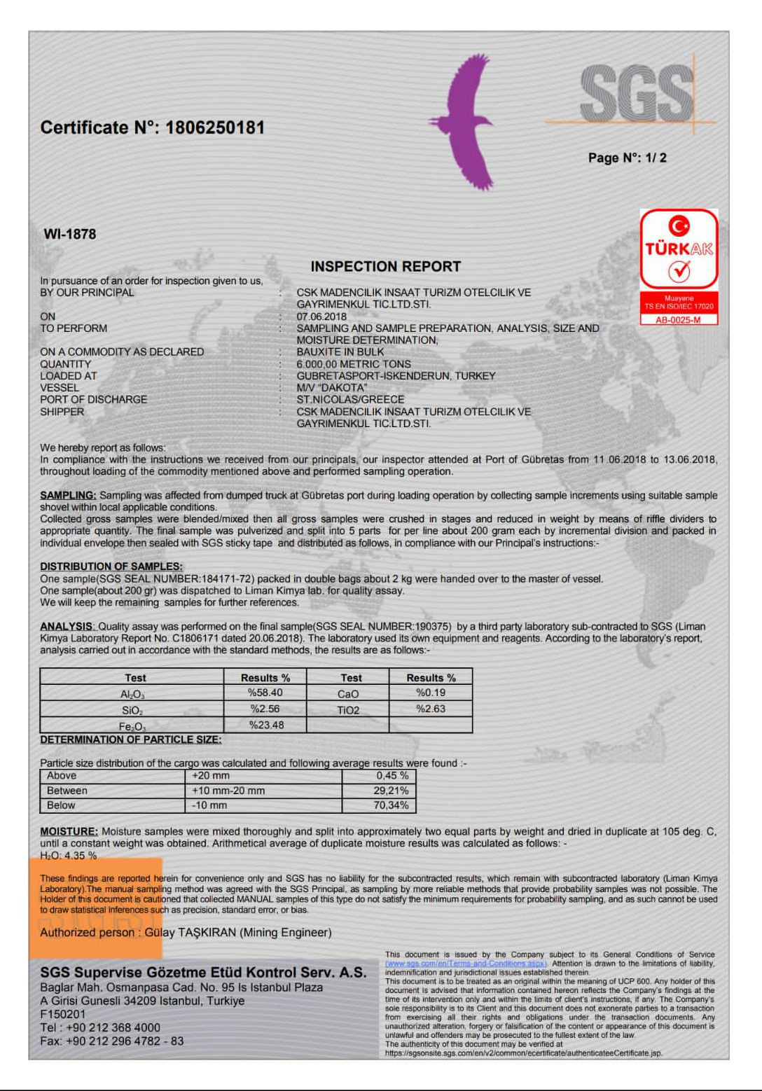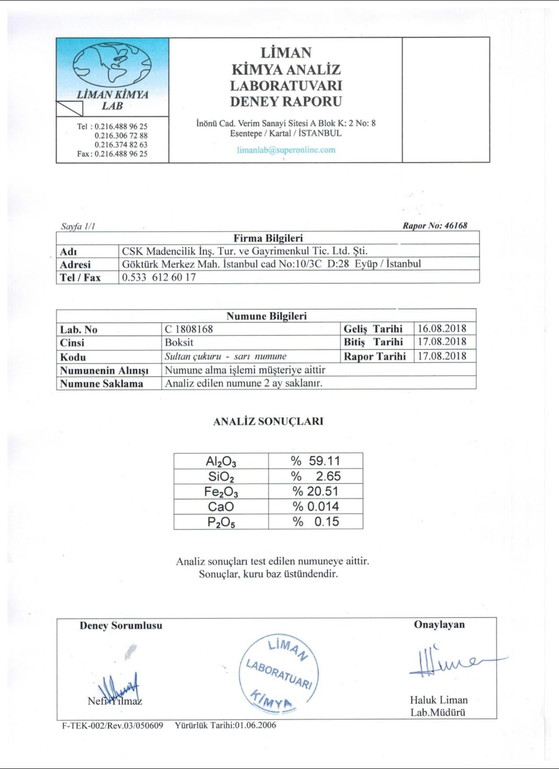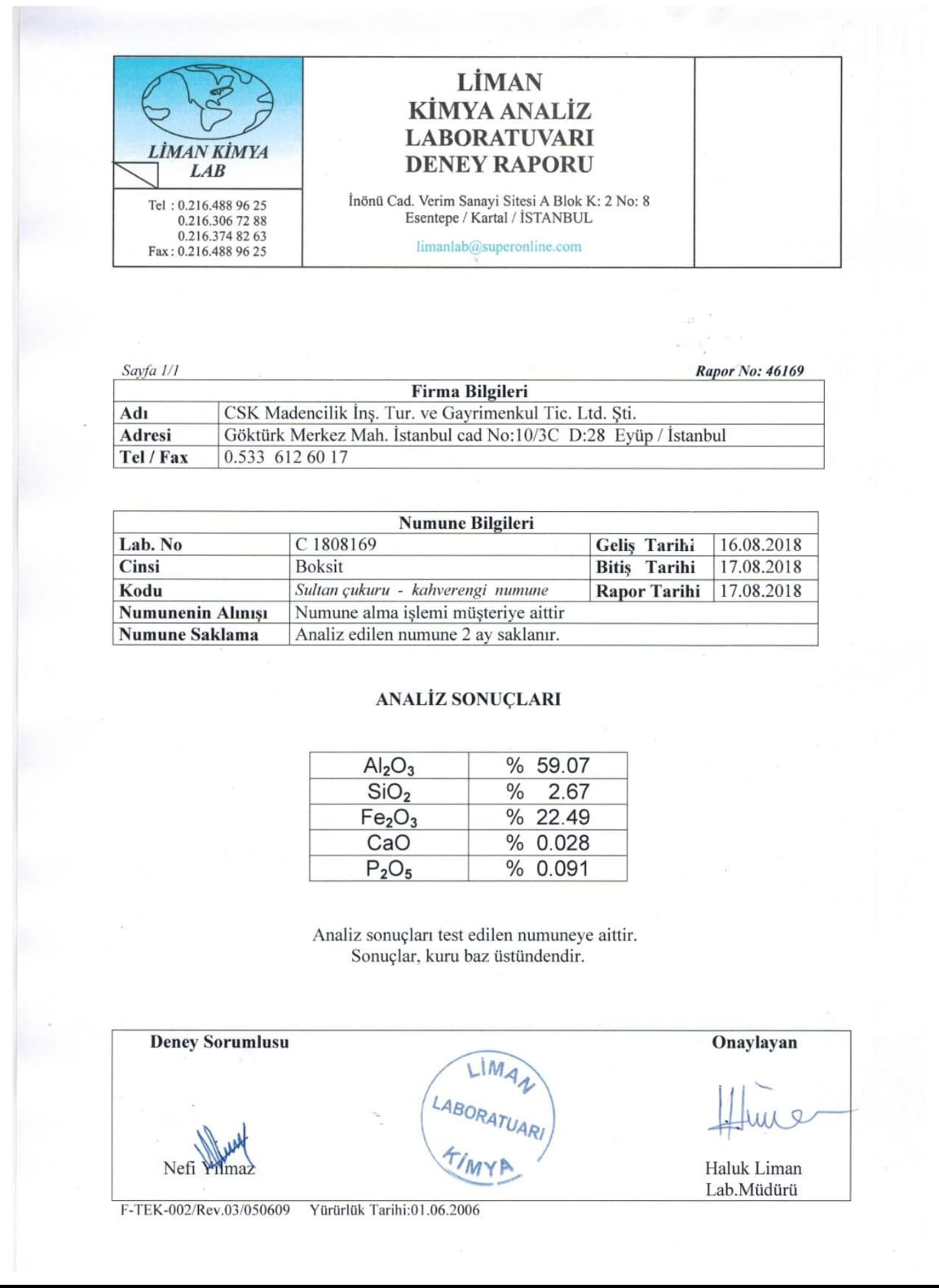 Antalya ili , Akseki ilçesinde 4 ayrı boksit maden sahamız bulunmakta olup 2 sahamız faaliyettedir.Henüz üretime başlamadığımız sahalarımızdan biri 2021 yılı içerisinde işletmeye açılacak olup diğerinin 2022 yılında faaliyete geçmesini hedeflemekteyiz. Faaliyet gösteren sahalarımızın ise yaklaşık rezervi 4 milyon ton olup bu sahalarda böhmit ağırlıklı cevher bulunmaktadır. Al₂O₃ değeri yer yer %68’dir. SiO₂ ise ortalama %2 civarındadır.